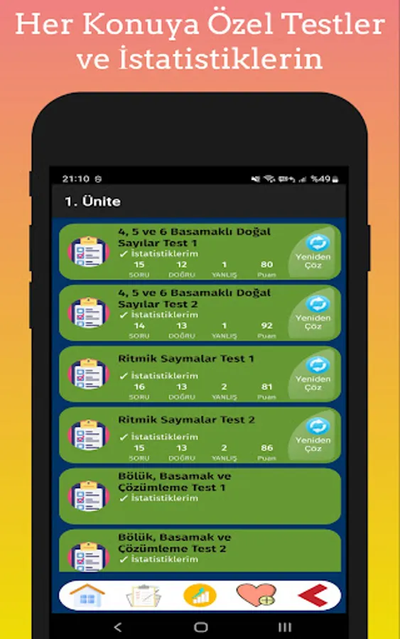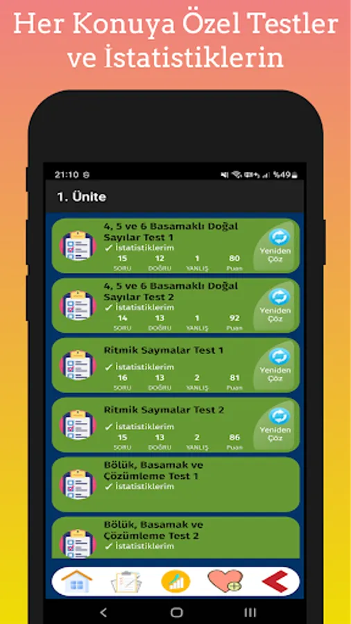✿ The Tests unit and subject matter are prepared separately. After you solve the tests, you can see your statistics about the tests. In this way, you can do extra work by seeing the lessons and topics that you are weak.