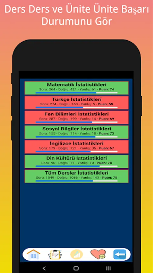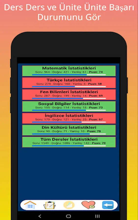 ✿ By clicking the My Statistics button on the main menu, you can see your success in the courses. In addition, when you click on the courses, you can see your unit-by-unit success. Courses and subjects with a score of 70 and above are shown with a green background, and those with a score of less than 70 are shown with a red background.