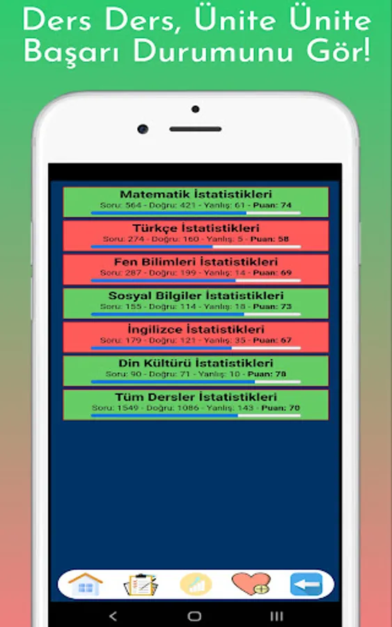 ✿ By clicking the My Statistics button on the main menu, you can see your success in the courses. In addition, when you click on the courses, you can see your unit-by-unit success. Courses and subjects with a score of 70 and above are shown with a green background, and those with a score of less than 70 are shown with a red background.