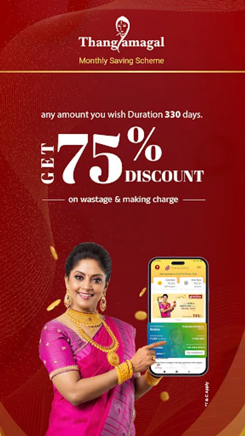 Thangamal is a fixed monthly savings scheme with a tenure of 330 days (11 installments) with benefit of getting up to 75% Discount on VA (Wastage + Making Charges) on Gold Jewellery and 60% Discount on VA for Diamond Studded Gold Jewellery and JewelOne Jewellery. Subject to full payment of all installments on time and redemption after 330 days. User gets credited as Amount in your Account and can be redeemed after maturity for amount saved.