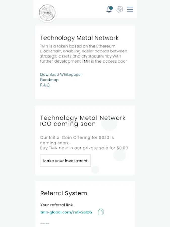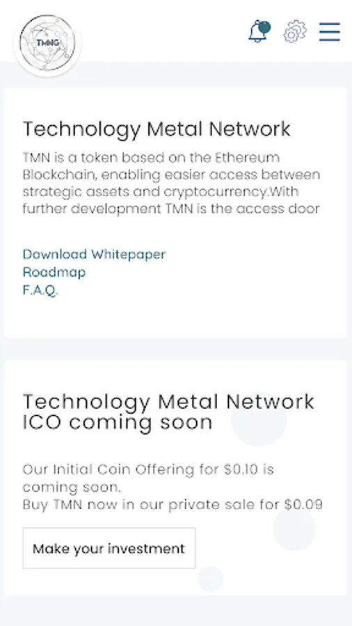 Technology Metal Network (TMNG) provides a digital currency and products for investors to combine strategic asset classes with modern cryptocurrency advantages. TMNG is directly partnered with two investment companies based in Liechtenstein: EMH AG and Red Cave AG. The use case for our TMNG token is that you can directly use TMNG to purchase strategic assets (precious metals, technology metals, or leasing equipment for mining oil & gas) from our partners in a “Coin Shop" online and in our smartphone app.