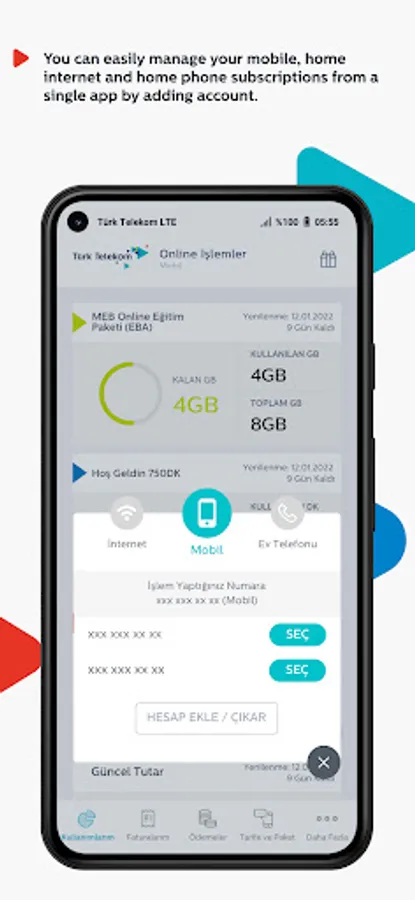 • You can combine your other Turk Telekom subscription accounts from the Account Management area, switch to your other accounts whenever you want, and have the convenience of managing all your accounts through a single application. Thus, you can perform your mobile, internet, Tivibu IPTV and home phone transactions using a single application.