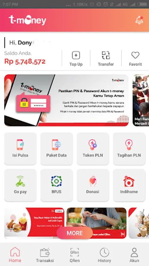As an electronic money service, T-money can be replenished (Top Up) to be used as a means of payment or purchase transactions on different types of merchants (multi-merchant).