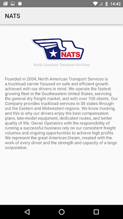 Founded in 2004, North American Transport Services is a truckload carrier focused on safe and efficient growth achieved with our drivers in mind. We operate the fastest growing fleet in the Southeastern United States, servicing the general dry freight market, and with over 700 clients. Our Company provides truckload services in 38 states throughout the Eastern and Midwestern regions. nnWe know trucking, and this is why our drivers enjoy the best compensation plans, late-model equipment, dedicated routes, and better quality of life. Owner Operators with the responsibility of running a successful business rely on our consistent freight volumes and ongoing opportunities to achieve high profits. We represent the great American Dream, created with the work of every driver and the strength and capacity of a large corporation.