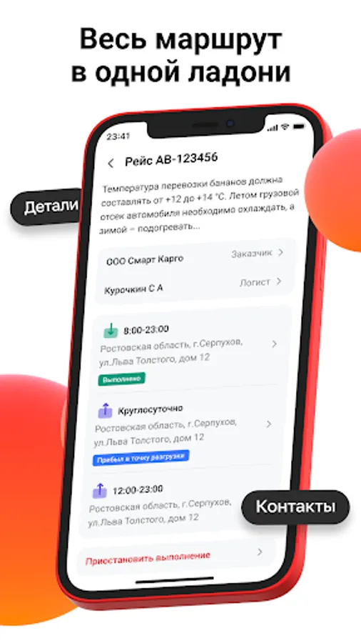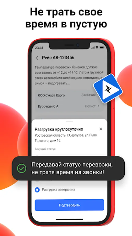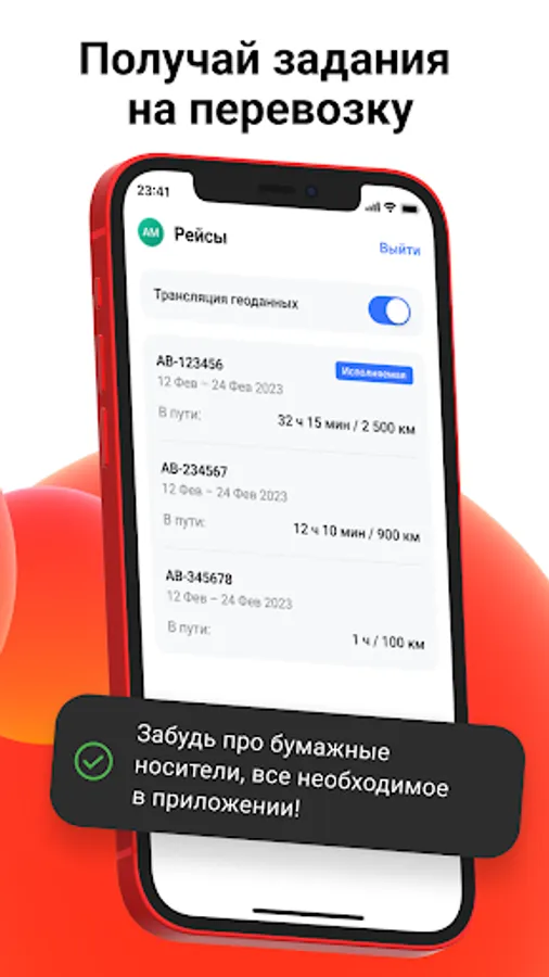 In the application, you can receive orders from a logistician, mark statuses and report problems on the route.