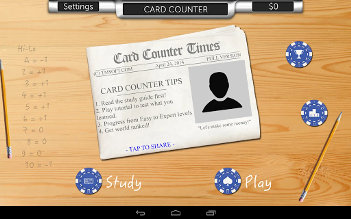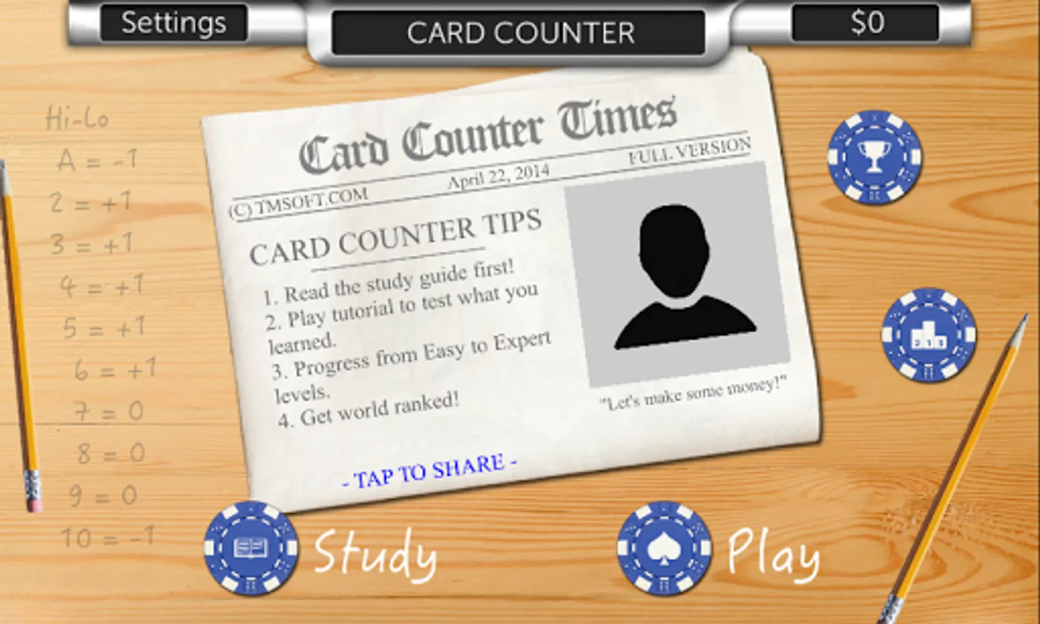 Card Counter is an exciting game based on real Blackjack card counting techniques. You love Blackjack and know what to do in every hand, but now you want more! Card Counter will teach you everything you need to know about card counting without having to enroll at MIT.