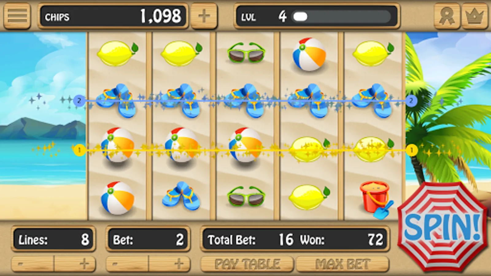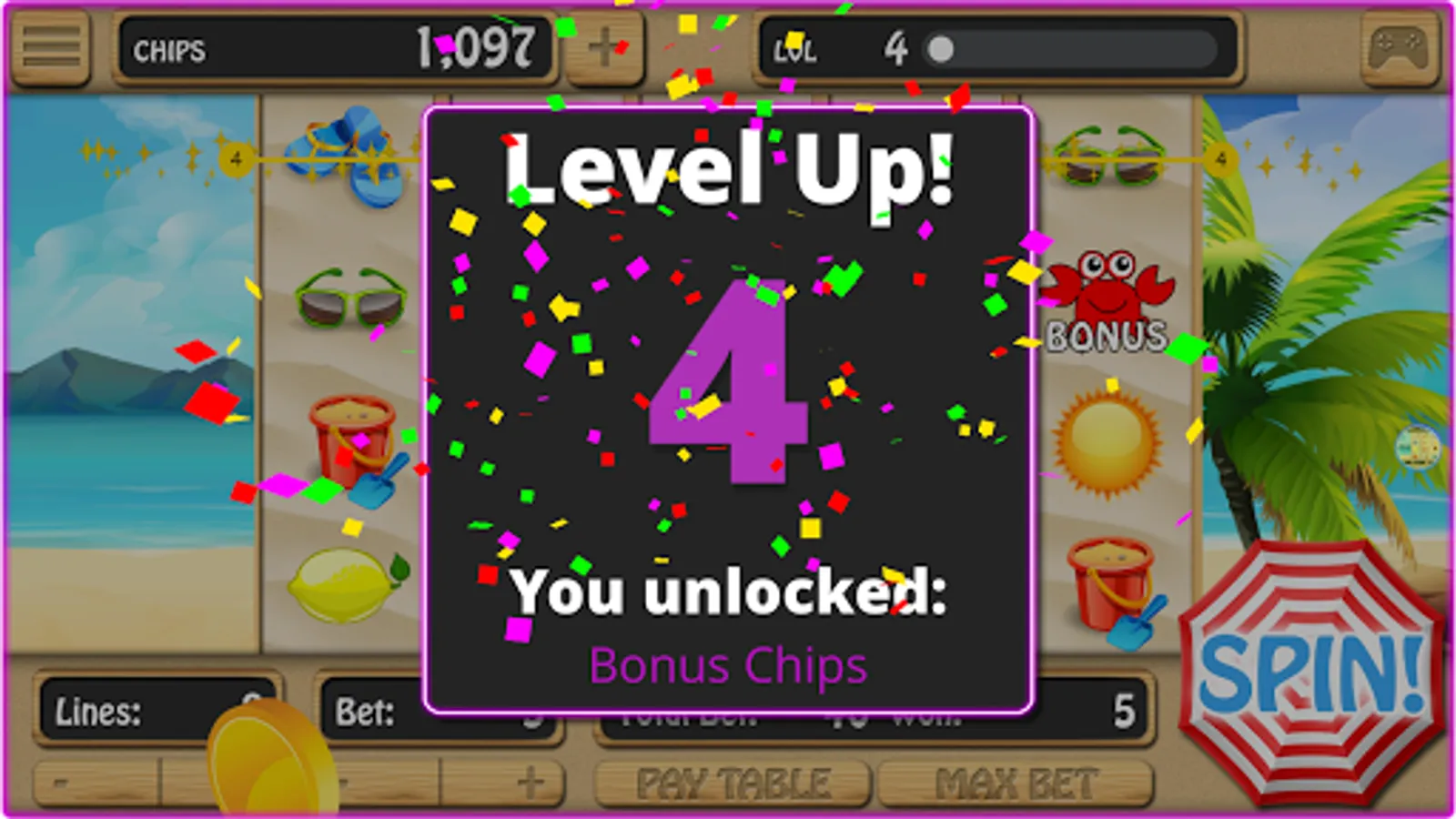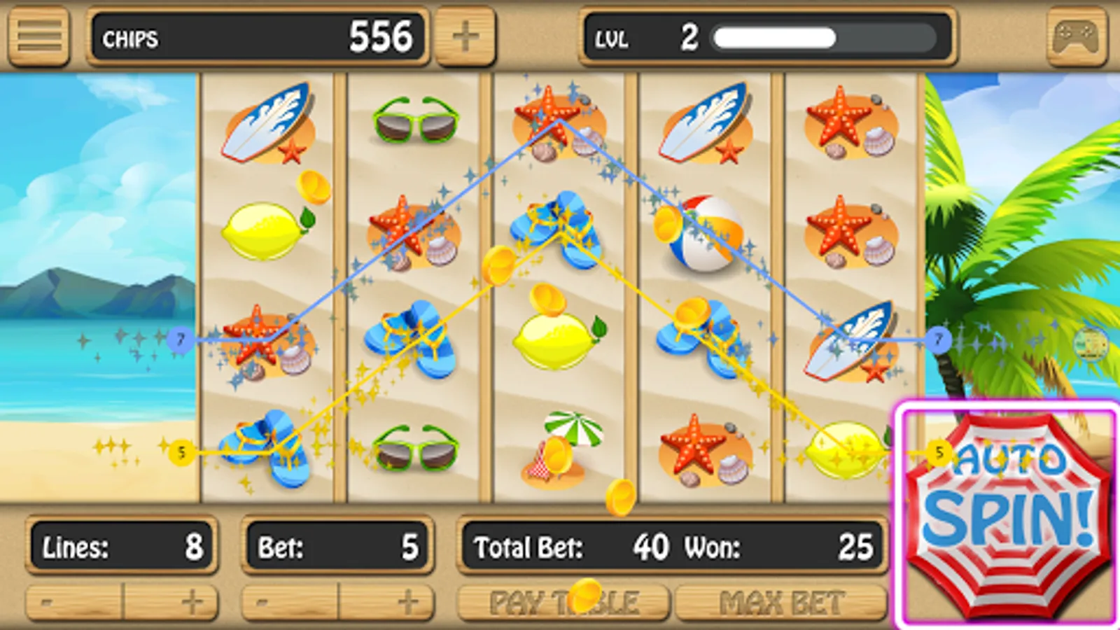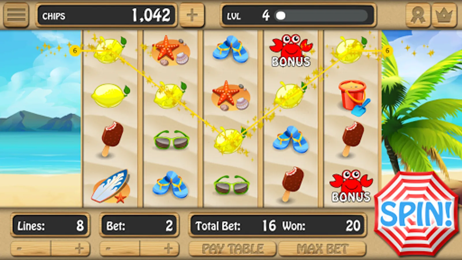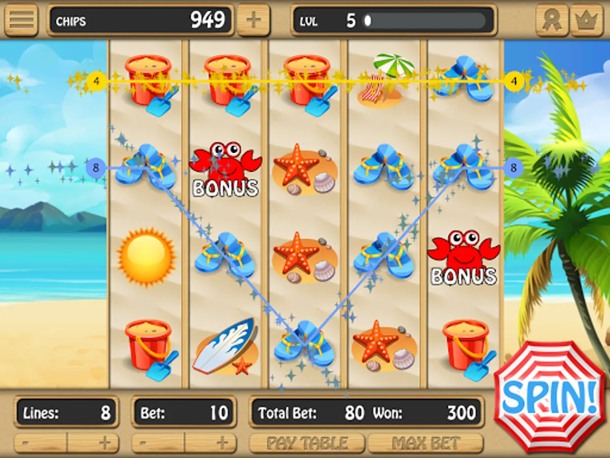 - Relaxing "Beach Bonanza" slots includes a Pachinko-themed Crab Bonus Game