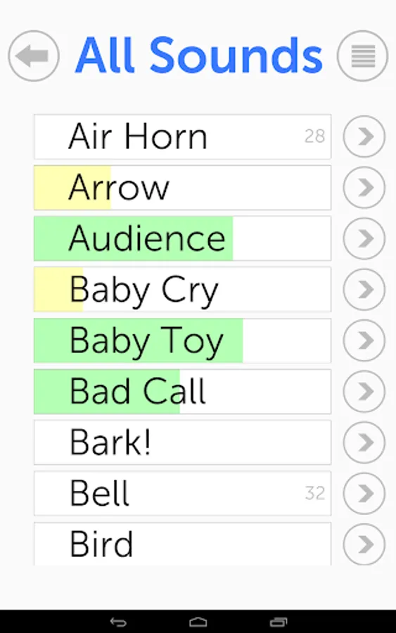 Scroll the list to get access to all your sounds. Tap the right arrow button next to the sound to toggle favorites and enable sound timers. Toggle the view between All Sounds and Favorites by tapping the view button located at the top right of screen.