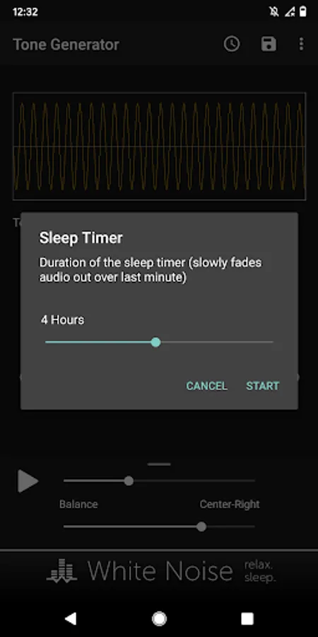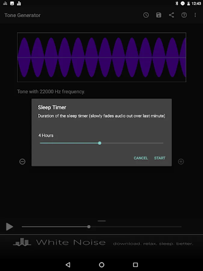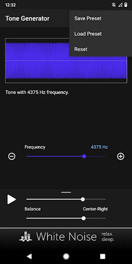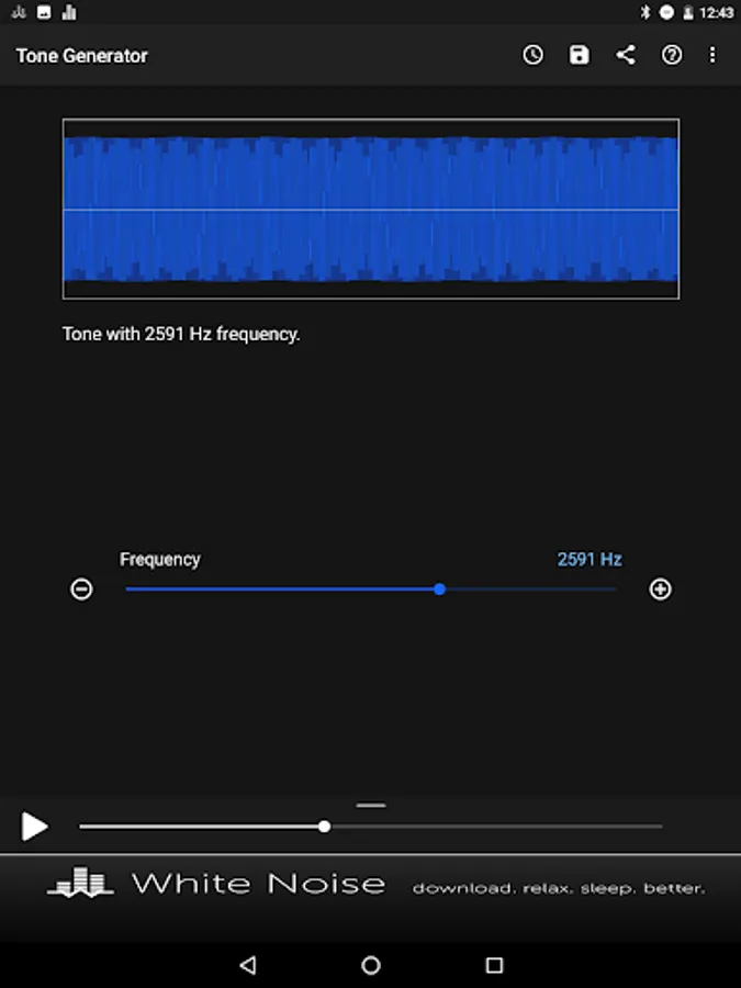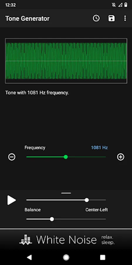 Adjust audio frequency by dragging the slider or tapping the plus/minus buttons. Adjust device volume using the on-screen volume slider. Toggle audio playback using the Play/Pause button.
