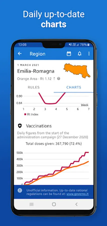 ➤ Display the weekly updated Rt index for each region and daily charts with the most recent data.