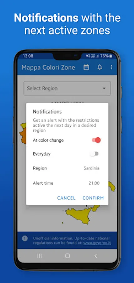 Check the daily map with the color of the area assigned to each of Italy’s regions.