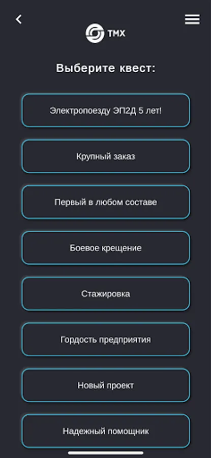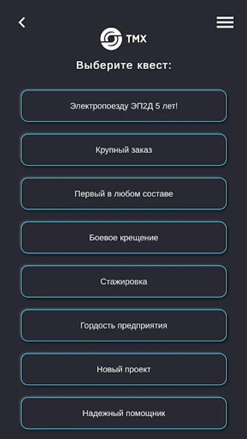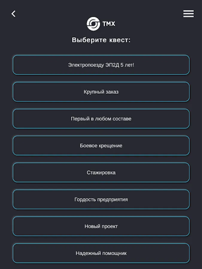 "QUESTS TMH" is an application with the help of which absolutely every employee of the TMH Group of Companies can visit any enterprise of the company, without even leaving home. In a playful way, users of the application get acquainted with the production and technological processes in production, complete tasks and earn stars to get into the general rating table.