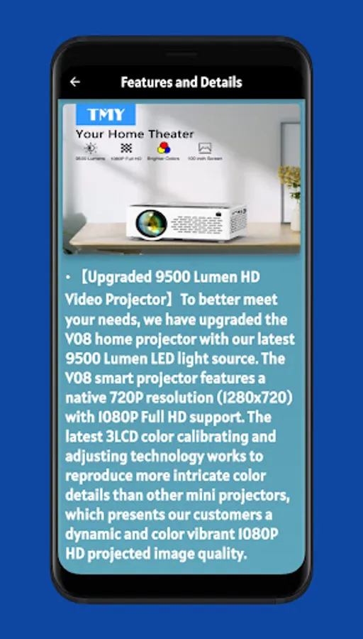 To better meet your needs, we have upgraded the TMY Projector guide with our latest 9500 Lumen LED light source. The V08 smart projector features a native 720P resolution (1280x720) with 1080P Full HD support. The latest 3LCD color calibrating and adjusting technology works to reproduce more intricate color details than other mini projectors, which presents our customers a dynamic and color vibrant 1080P HD projected image quality.