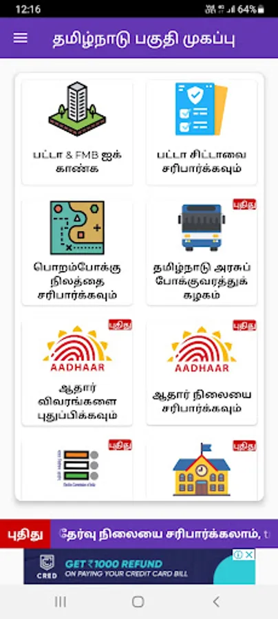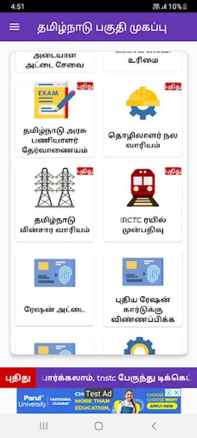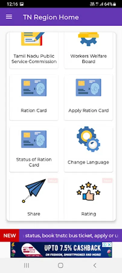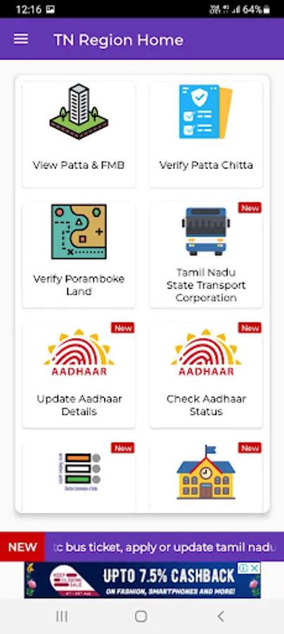 The app aggregates links to websites for popular government services like VOTER ID, Aadhar, TNPSC, TNSTC, RTE and Ration services and displays this information inside a mobile browser.