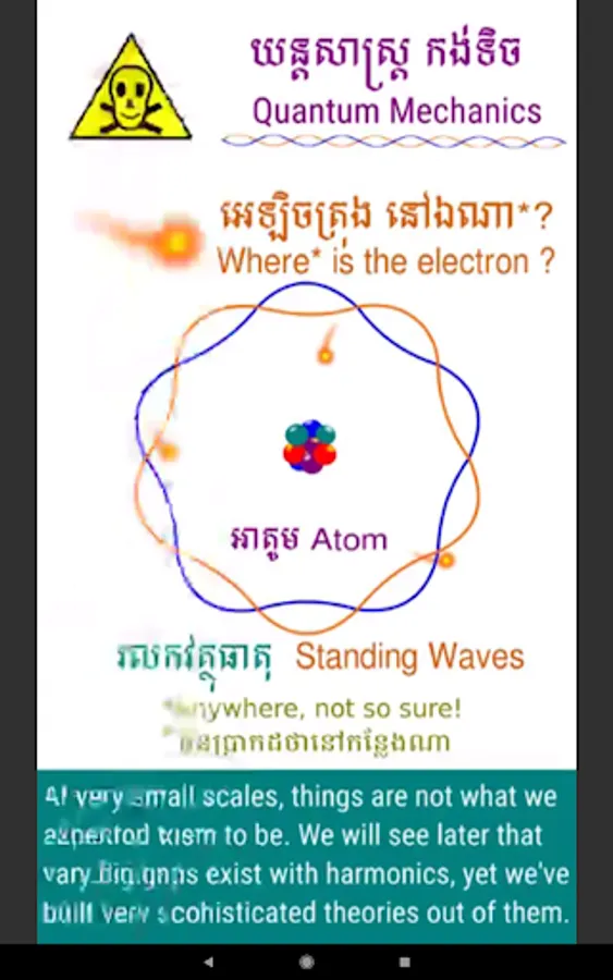 Short illustrations and a sound waves DIY yourself experiment wrap up this app in an attempt to lay the groundwork for future generations of Khmer musicians familiar with Nanotechnology, Quantum Mechanics (Wave Mechanics) and Artificial Intelligence, to find out more about Music which is not only a co-evolutionary aspect of the human species along with spoken languages but a defining characteristic of Matter* as De Broglie (Joseph Sauveur before him in the 18th century) and later on Schrodinger proved if the ubiquitous electrons spinning around the nucleus of an atom don’t disintegrate into its core, it’s because there is a thing called “Standing Wave” the length of which is twice the length of a musical instrument scale length that, when pressed down at the middle, makes the same sound as the sound it produces when vibrating freely on its whole length without any finger pressing on it. Across cultures around the world, this string-wave phenomenon, known as Octave (oct- : 8) is true for all musical instruments with fixed strings at both ends.