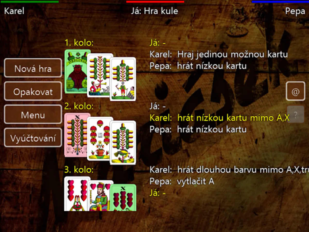 - Závěrečná rekapitulace umožňuje prohlédnout si hru kolo po kole a zjistit proč se rozhodl počítač ten který tah zahrát.