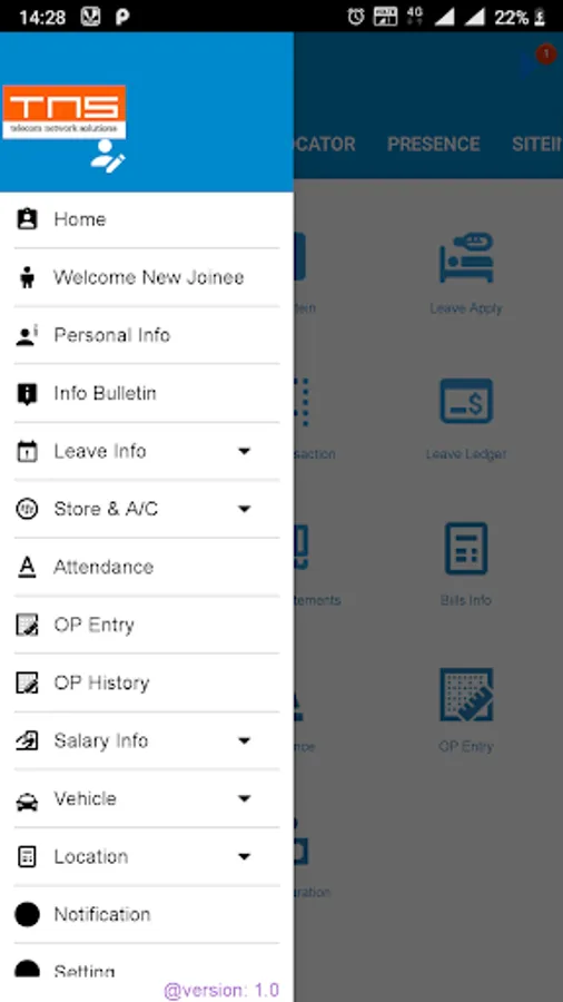TNS App is Basically used for employee management with the help of esp. Employee can check or download the salary slips, attendance, and can mark the attendance with live location. We can apply leave through ESP. Employee can reimburse the claims and send the paper bills .We can track the vehicle live location and many more.