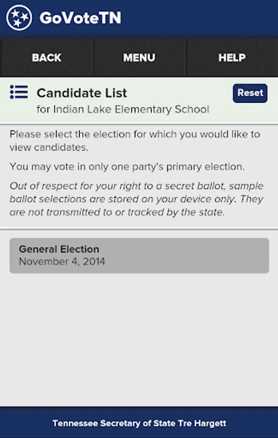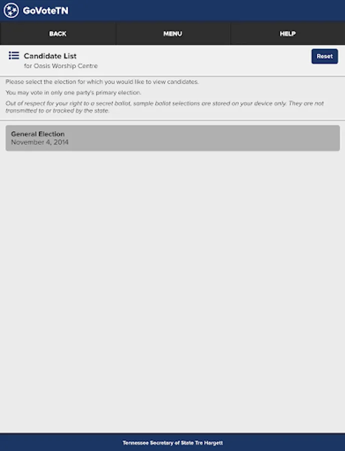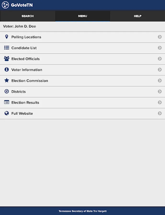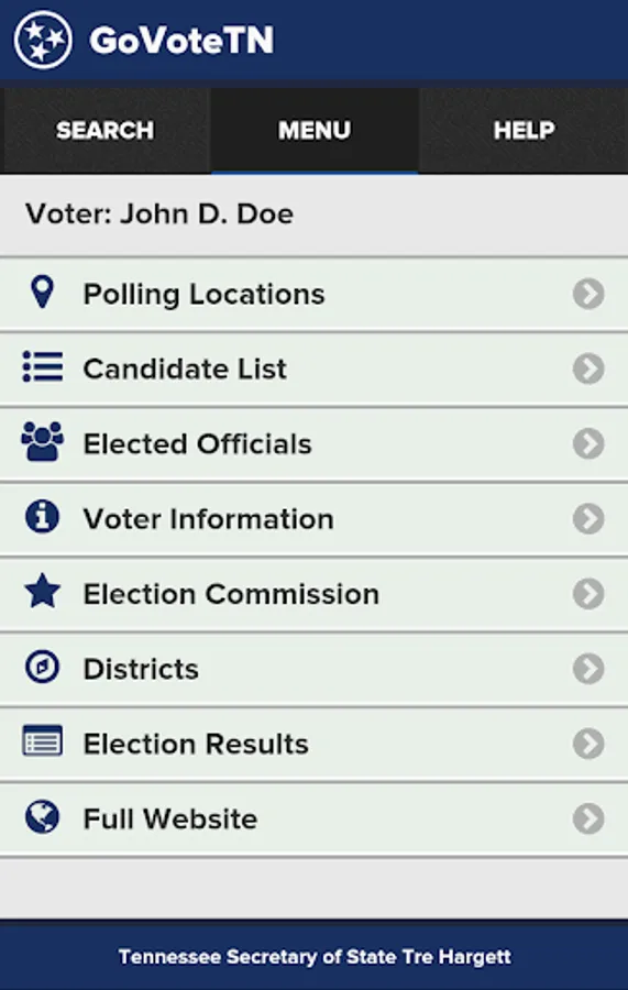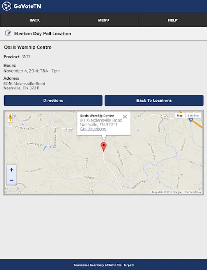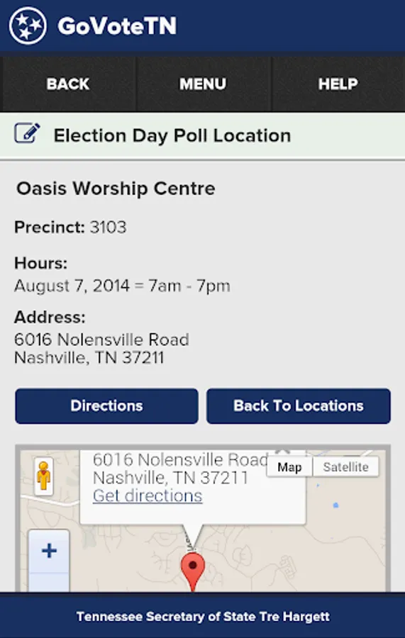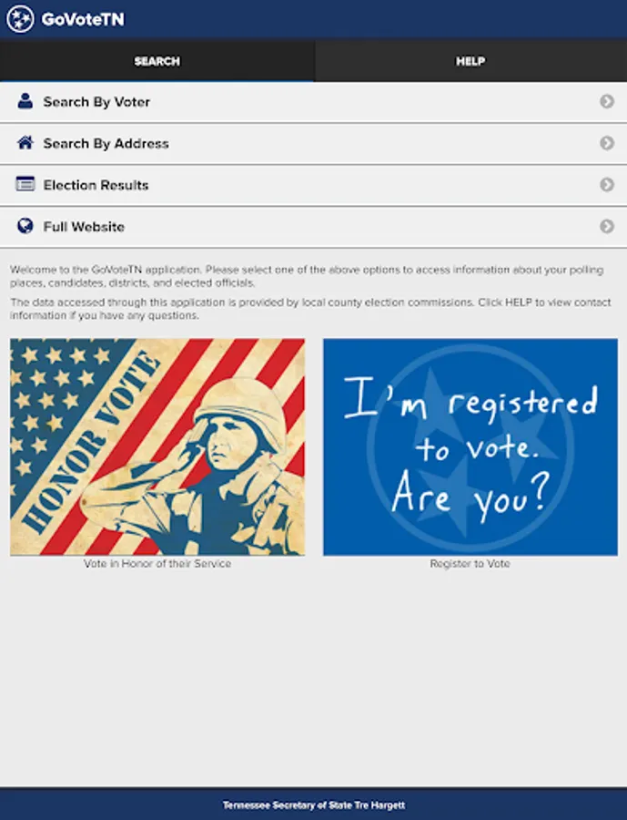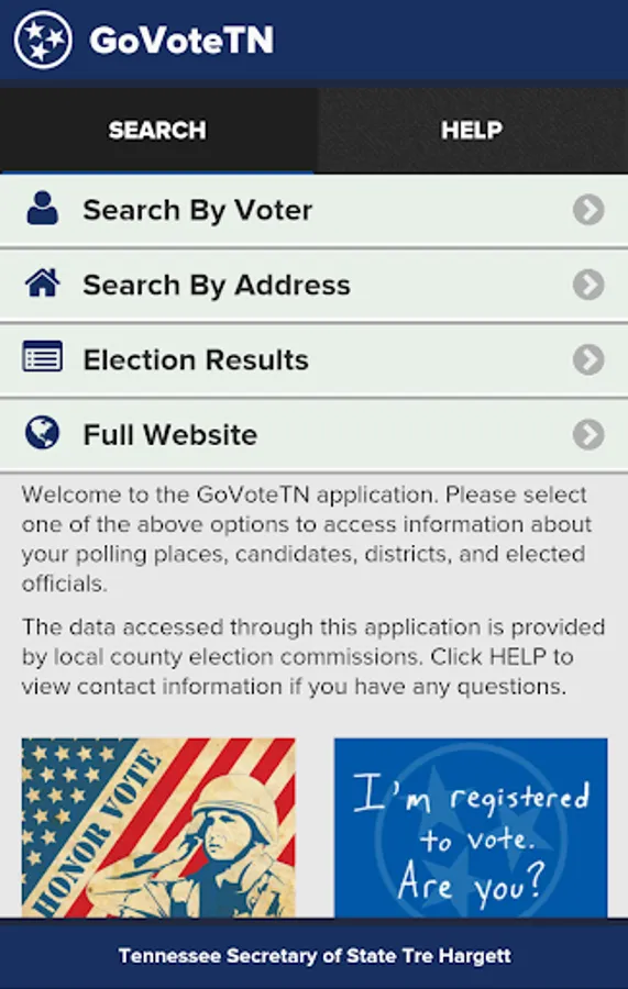 Tennessee voters can use this application, provided by Tennessee Secretary of State Tre Hargett, to view voter-specific information when searching by name or address. Voters can find early voting and Election Day polling locations, view and mark sample ballots, see their elected officials, districts, and county election commission information, and access online election results through the application. Information in the application is provided by Tennessee county election commissions.