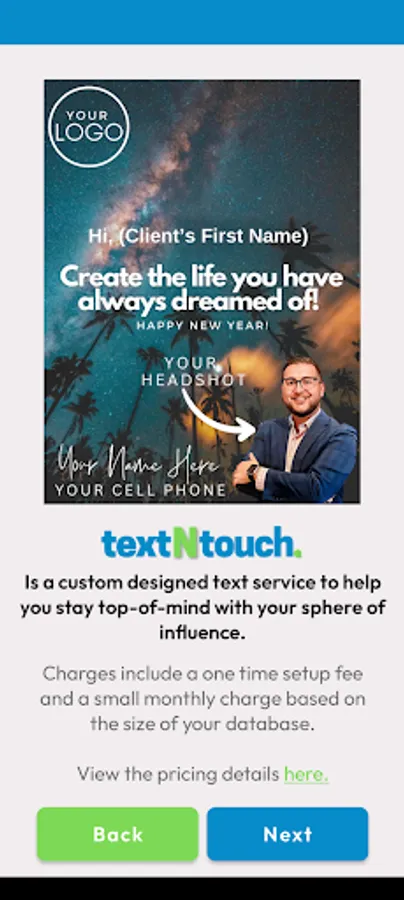 We send a personalized, high quality picture text once a month to your database. Your photo and your client's first name will be ON the image itself. Zero manual labor on your end! Choose your design once a month, and watch the responses flood in. That’s it!