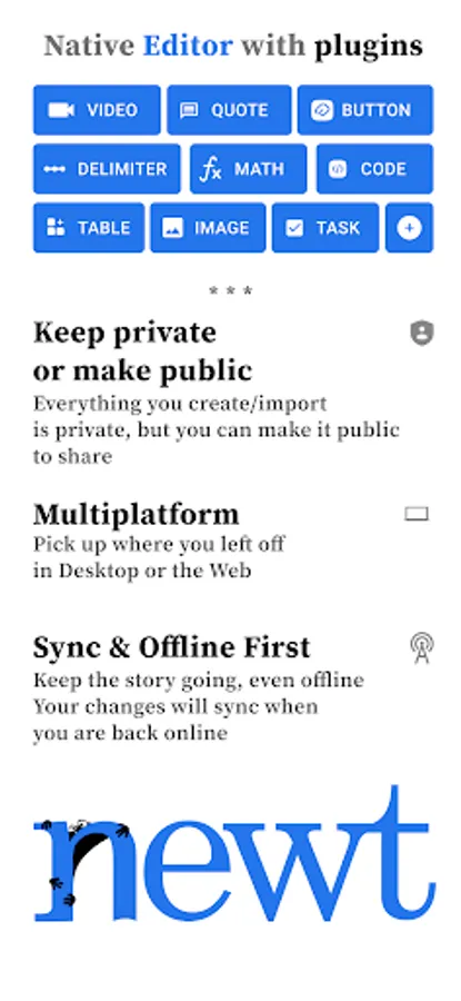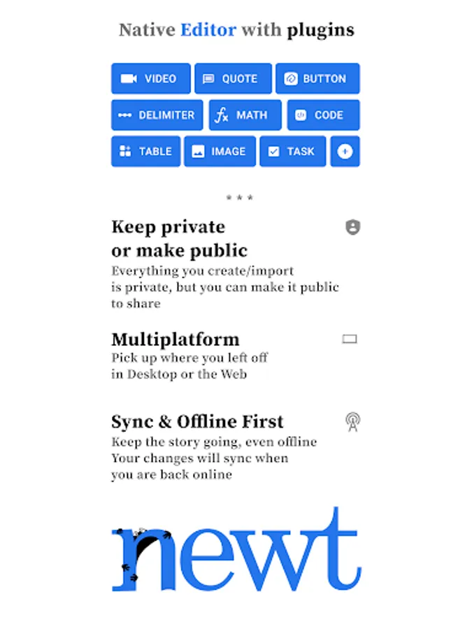 # Offline First: Newt works offline first, so you can keep at it even without connection.