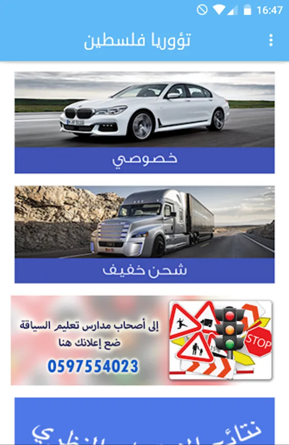 Taoria Palestine is an application that helps a student who wants to provide for an exam Taoria in Palestine where you can study the signals and the cases of both the road and the vehicle (special or light charging) and access to Ahakhsat of all kinds and the student can know its outcome in the official theory test, then you can provide experimental examinations in order to know your level.