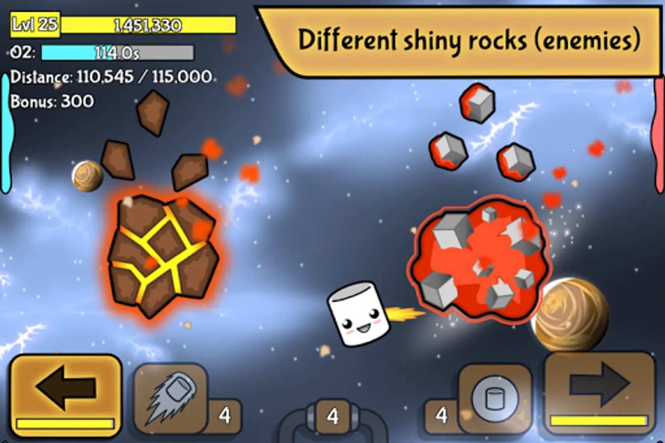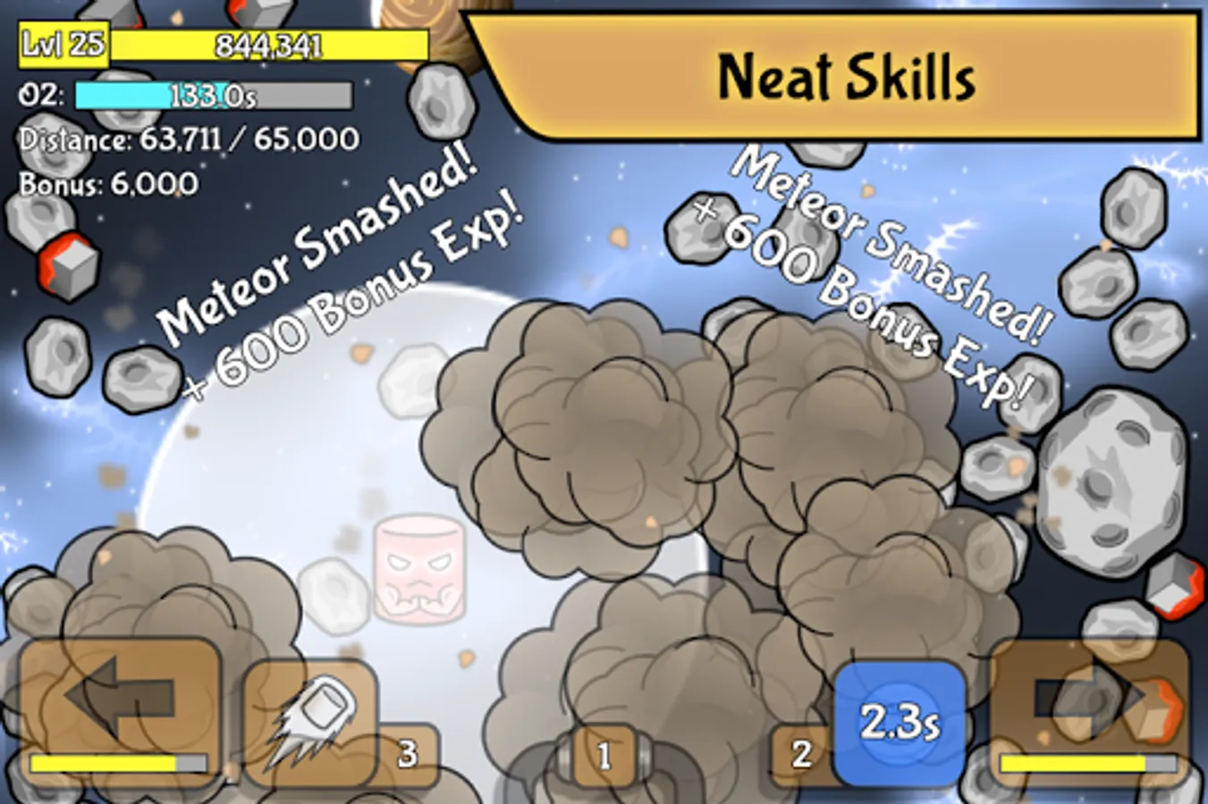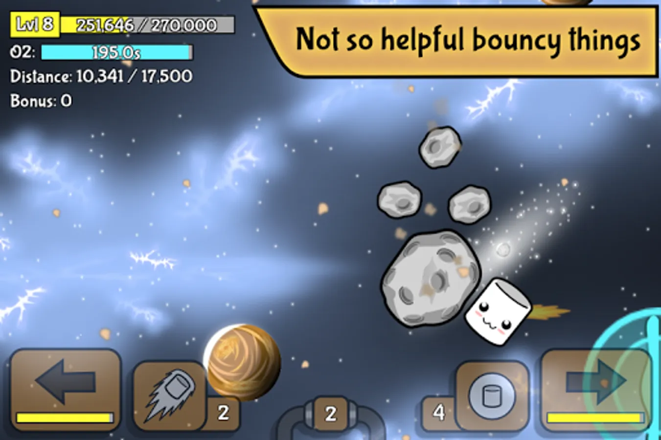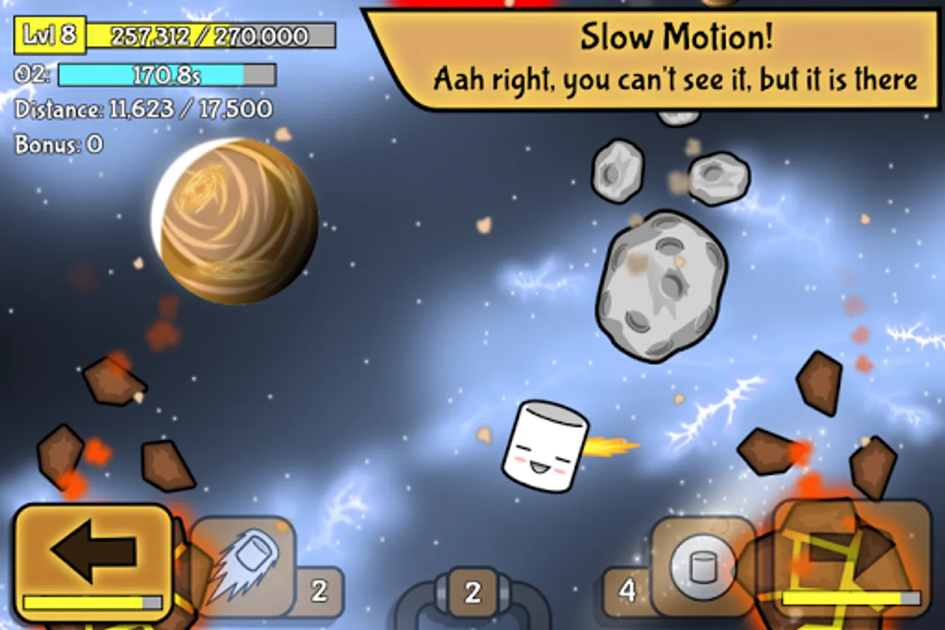 Marshmallow Toast is a launcher game where you have to help Marshmallow get to the safety of his destination by either dodging meteors or, with your neat special skills, destroy all those who dare cross your path...or I guess headbutt them if you're out of skills and hope you can still make it to the checkpoint.