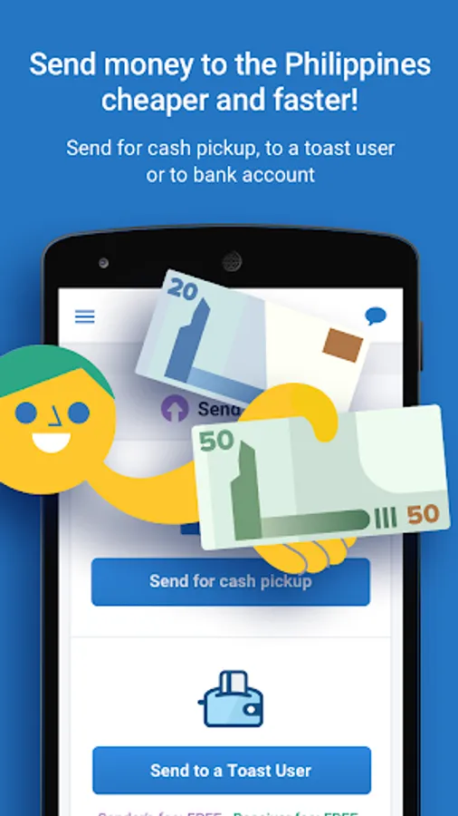 Send money to the Philippines instantly. We support cash pick up transfers to Cebuana, MLhuillier as well as direct bank transfers to BDO Bank, BPI Bank and more. Money transfers with Toast are same day. Instant, padala, walang pila. Deposit money easily into Toast using Super Toasters or make a simple bank transfer.