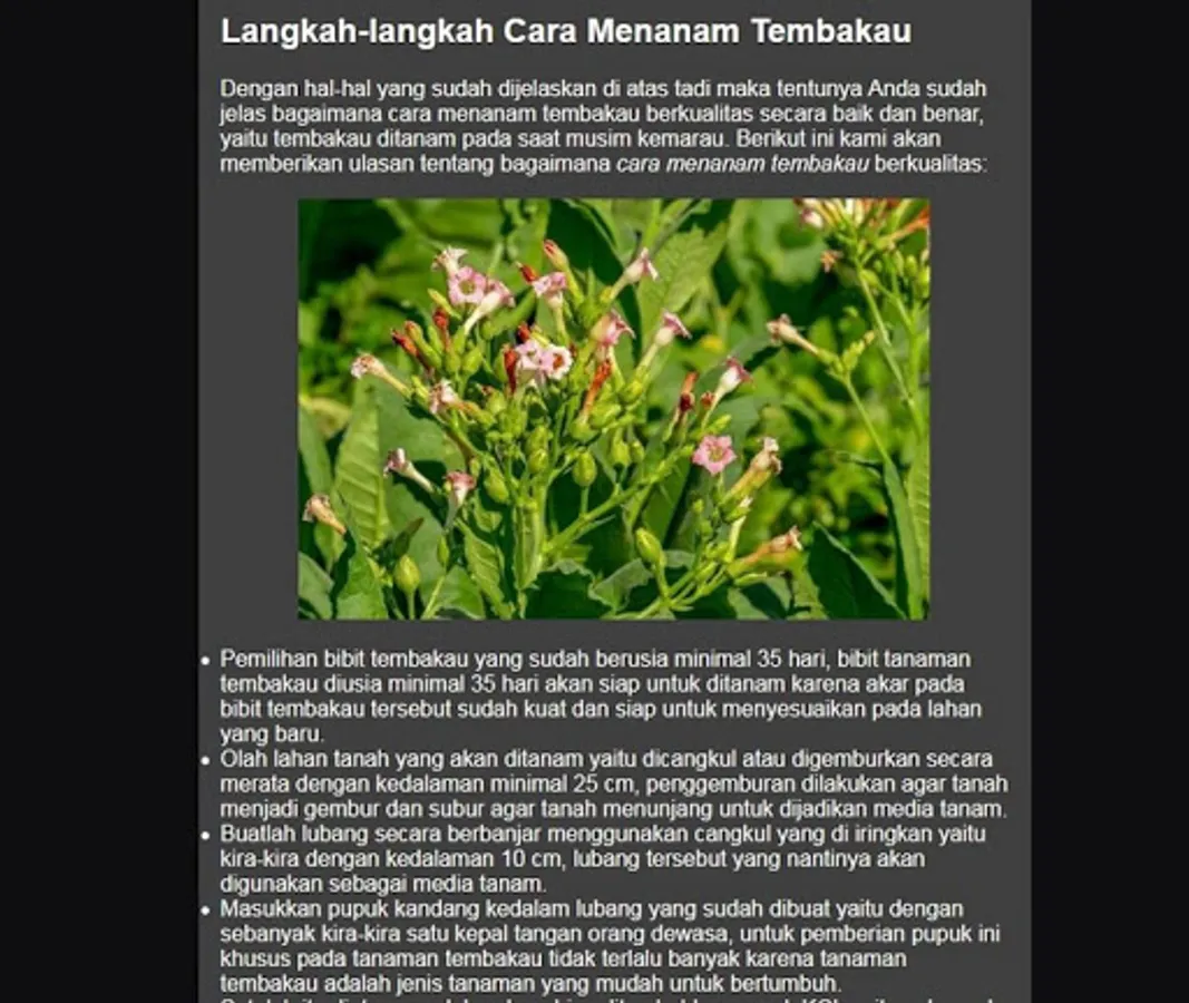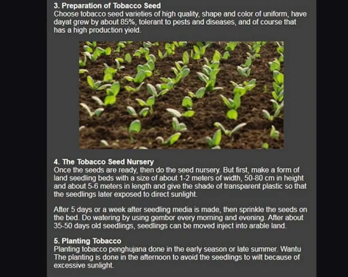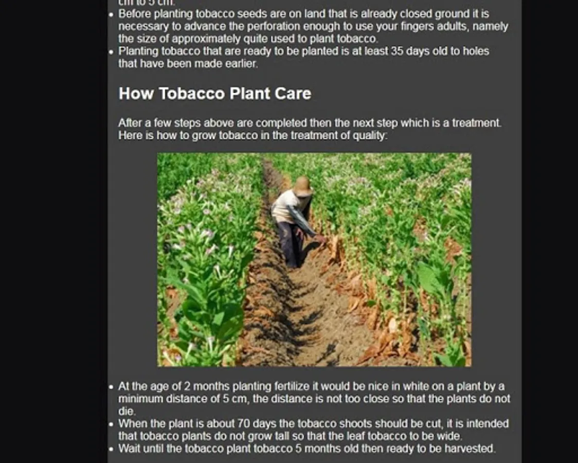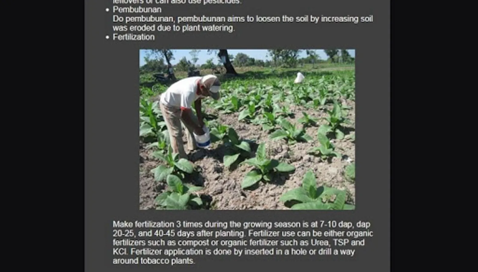 Tobacco plants are plantation crops as raw material for smoking products that have economic value is very promising. Tobacco crop cultivation systems together with systems for other plantation crops cultivation and consists of nurseries, land preparation, planting, maintenance, harvesting and post-harvest. This application contains the correct way tobacco cultivation and can make a good quality tobacco. Many of the tips contained in this application, immediately download this application. Thank you