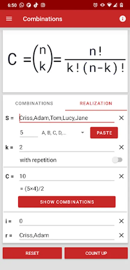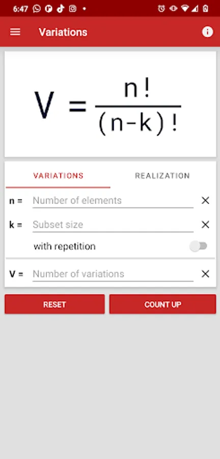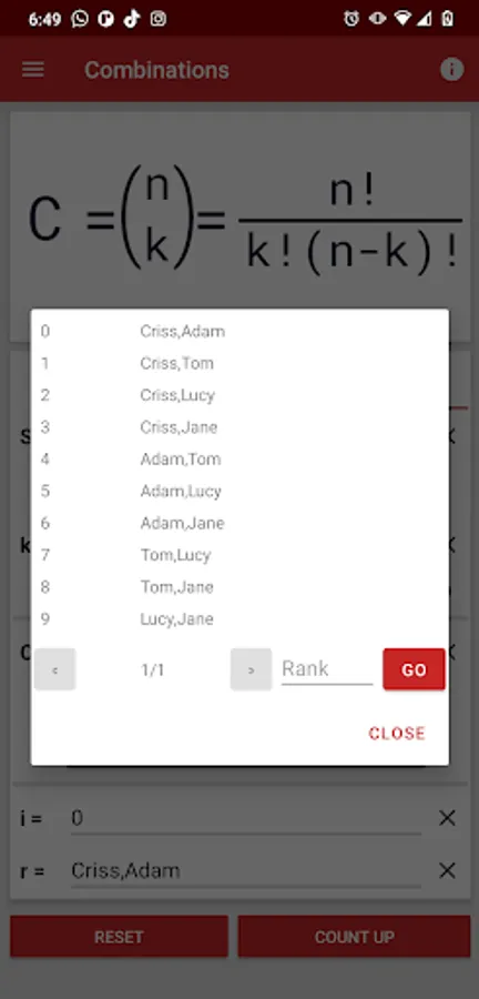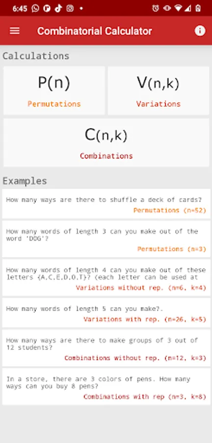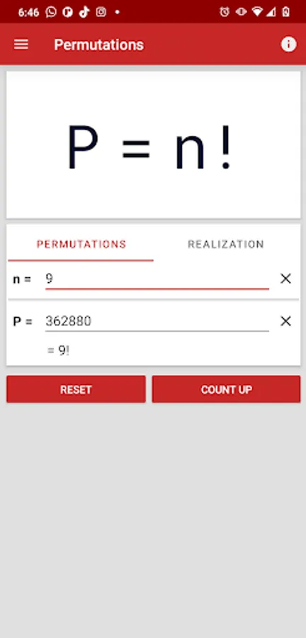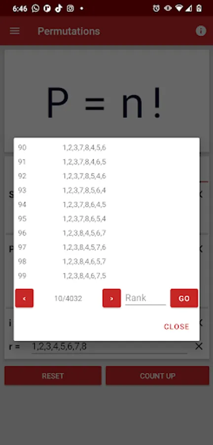 This is the perfect app for solving school problems. Compute factorial of n to solve permutations problem. Show permutations and find their ranks. Find how many ways there are to make a group of 3 out of 12 students (combinations). Find all variations for the safe password (variations) and many more.