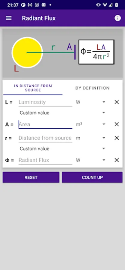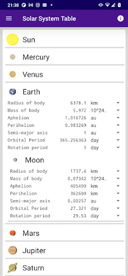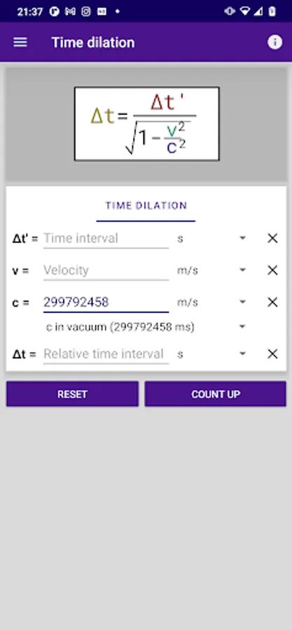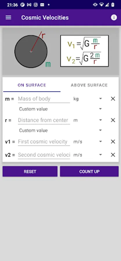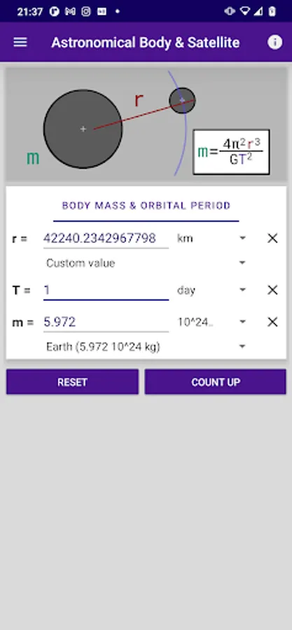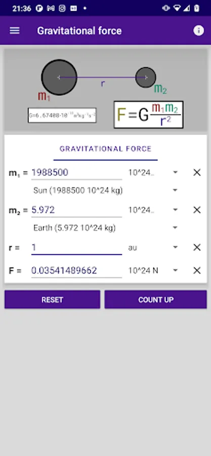 The app is very easy to use and contains many predefined values (e.g. mass of planets)
