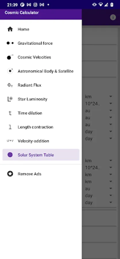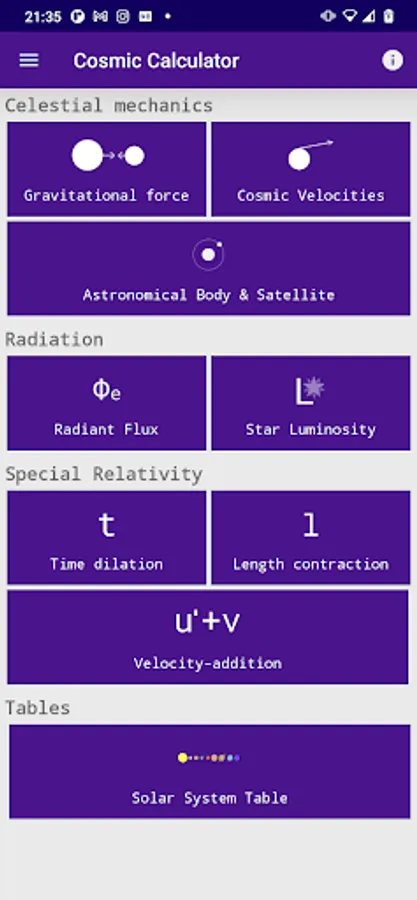 Astrophysics calculator for students. The app contains many calculations for example Gravity force between two bodies, the first and the second cosmic velocity. You can also calculate the orbit time and radius of astronomical bodies. There are also calculations for special relativity: time dilation, length contractions, and velocity-addition formula.