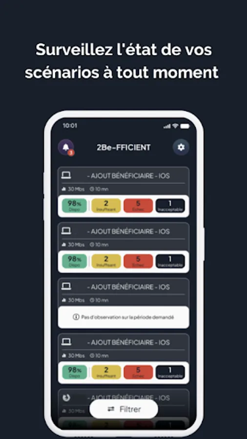 With 2Be-FFICIENT, monitor the performance of your scenarios in real time on your mobile applications and websites. Consult your key indicators to ensure the proper functioning of your platforms.