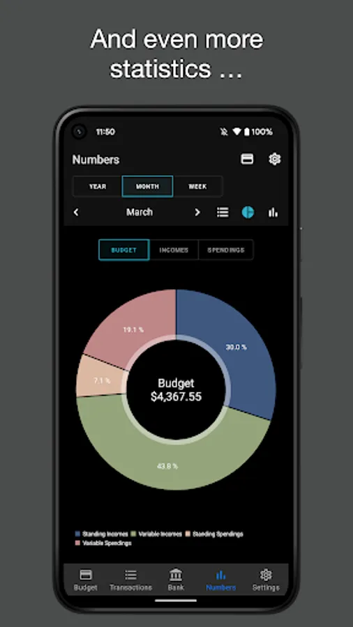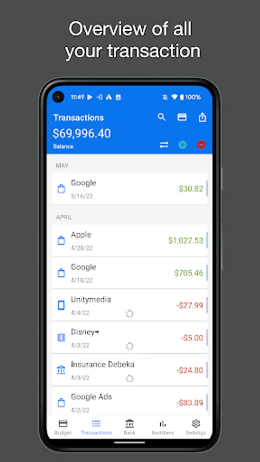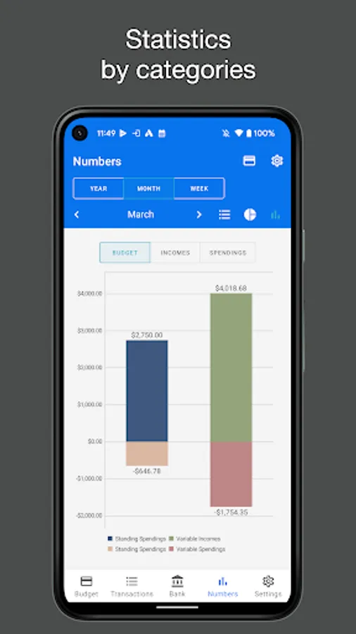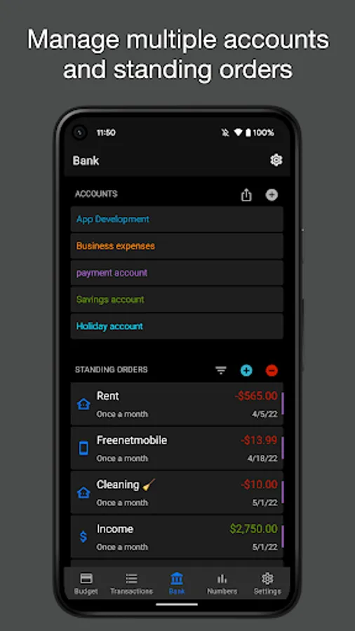 Use the statistics to keep track of your monthly income and spendings and discover opportunities for savings. Manage your finances in different accounts and categories.