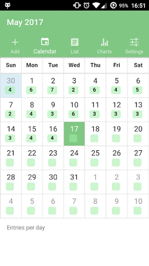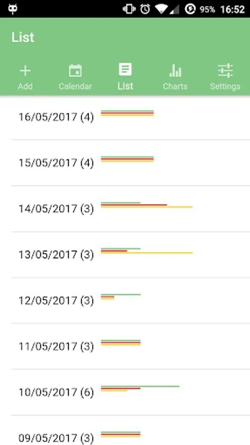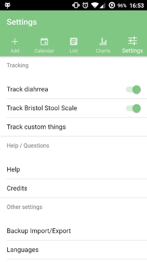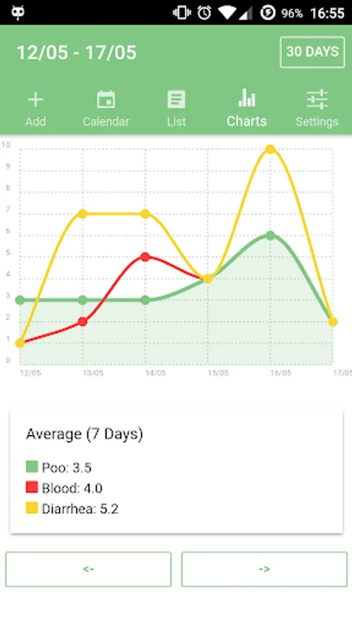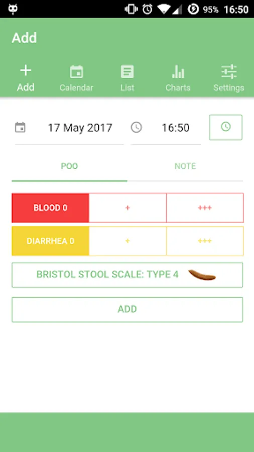 You can easily add new entries and see a chart of all your bowel movements over time. (All the data stays on your device so you keep control over them)