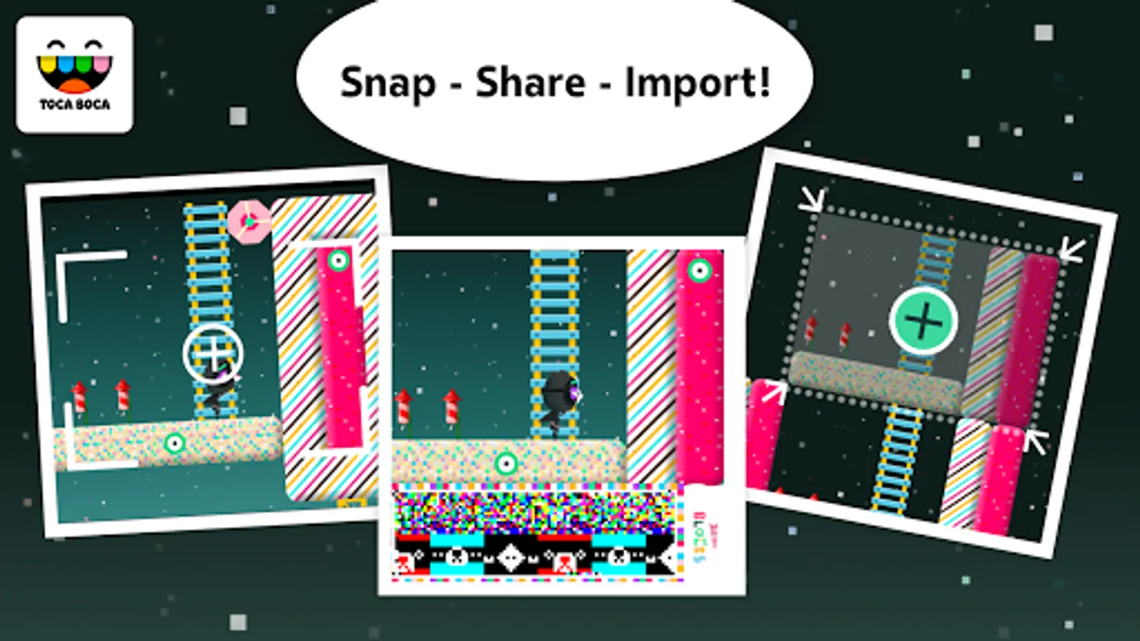 Save and share all the great work you’ve put into your worlds. Use the camera function to snap a photo. Share unique Blocks codes with family and friends so they can import your world and explore it themselves! Or import your friends’ worlds and make them part of your own!