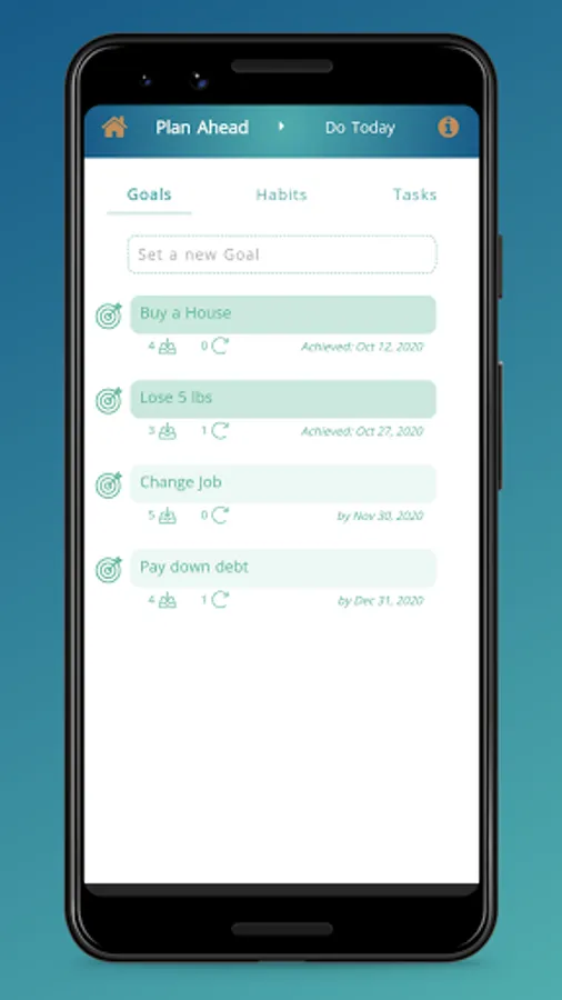 2. GOALS - Set Goals with target completion dates. View all Tasks and Habits linked to a Goal in one place.