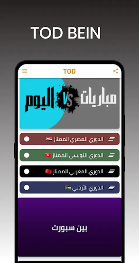 The TOD TV Bein Sport Live application is a unique application that aims to provide the best viewing experience for sports fans, especially those who follow live broadcasts of football matches from various leagues and tournaments around the world. This app is an ideal destination for those who are looking for the best quality live broadcasts and the easiest way to access the matches they want to watch.