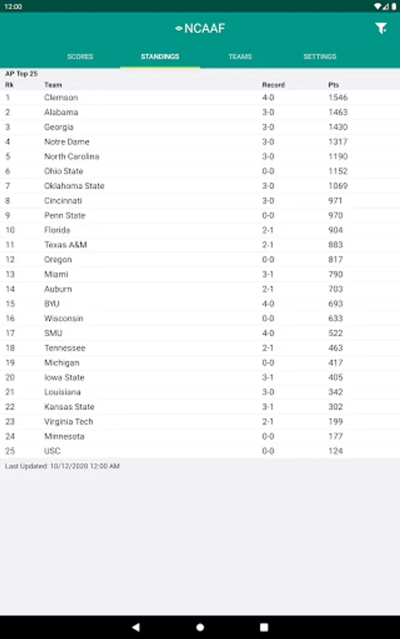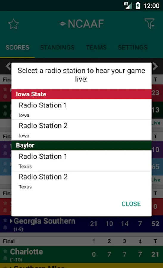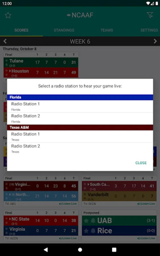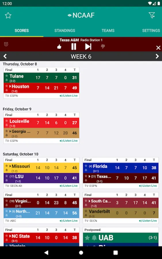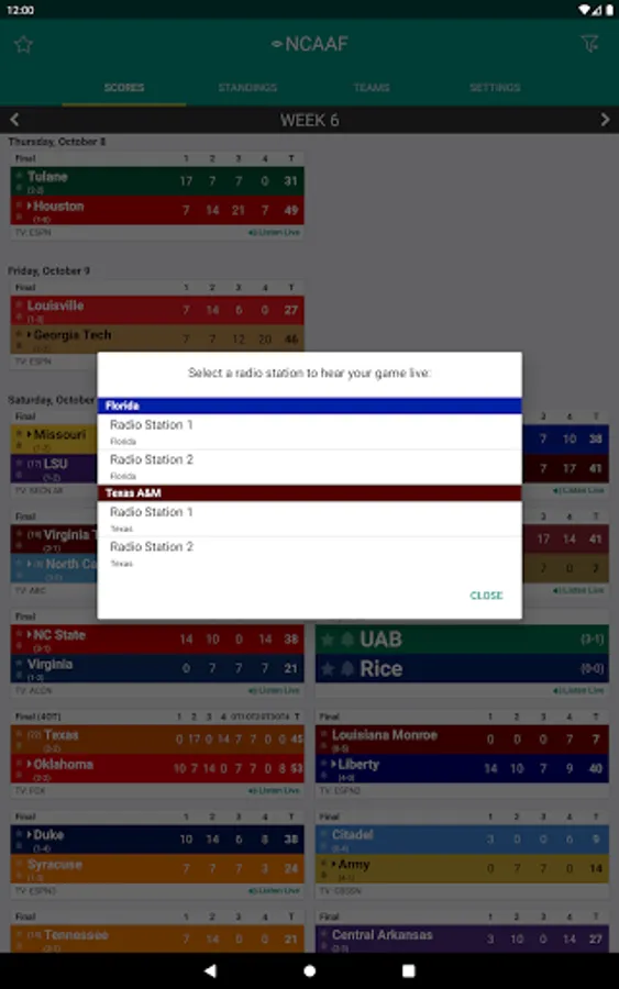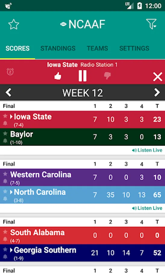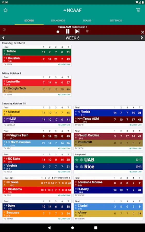 College Football Radio delivers up to date scores, schedules, and standings, and allows you listen to local radio stations for games live. The scores constantly update so you will never miss any sports action again!