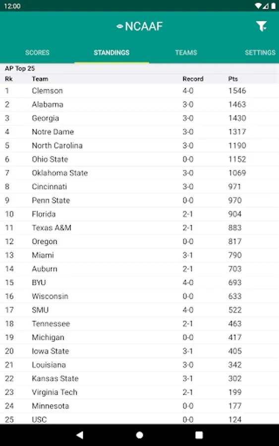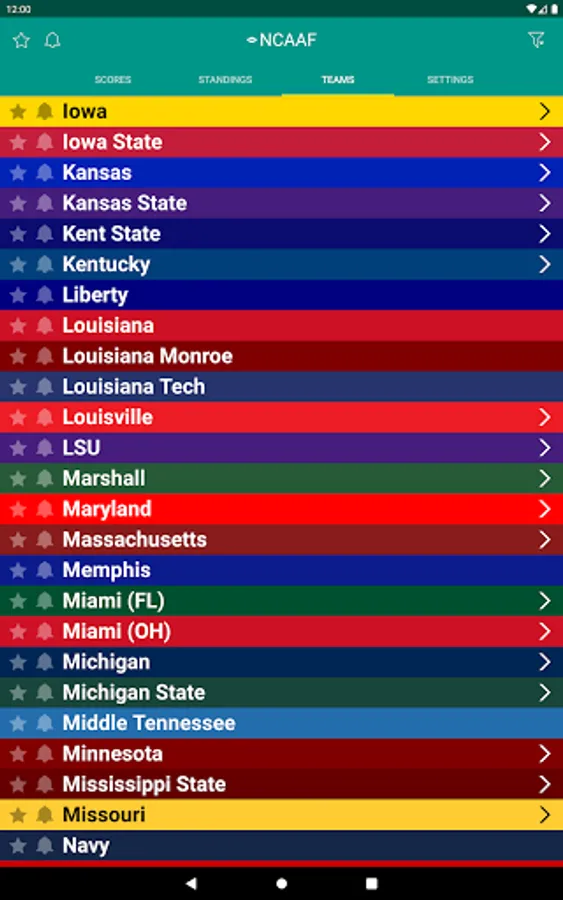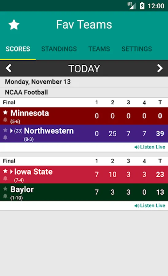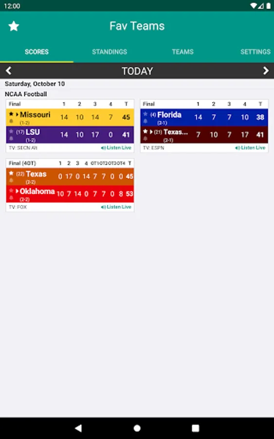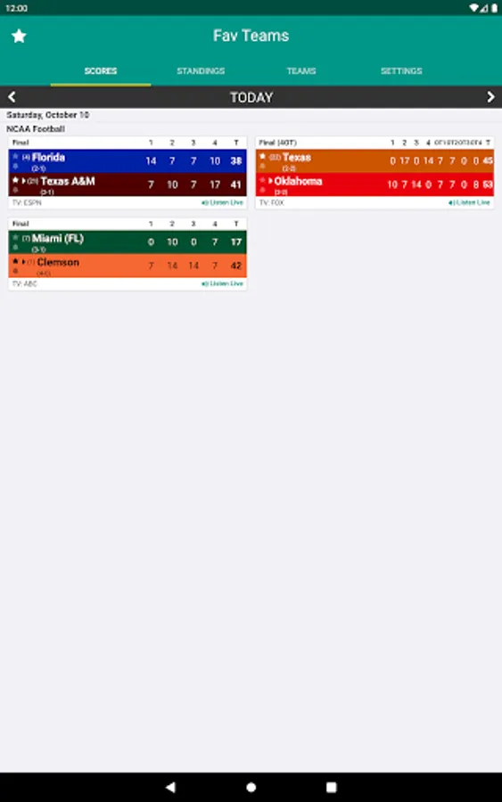 Setup your favorite teams, and view them all on the same page for easy browsing. We made it easy to check out cfb stats and analyze your favorite teams scores throughout the season!