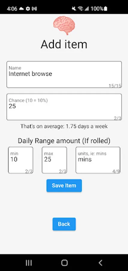Each day the habits/items you have entered will either be ALLOWED or NOT ALLOWED and only in your allowed range of will be allowed.