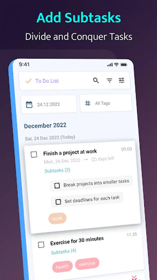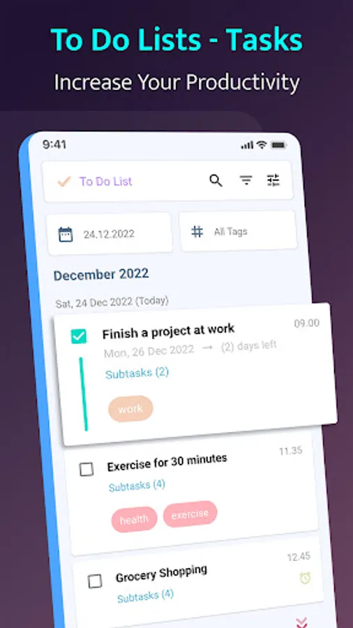 Stay organized and on top of your daily agenda with To Do List and Tasks - Checklist. Our easy-to-use checklist and to do list app allows you to create checklists and to-do lists to help you manage your routine and plan out your day. With our app, you'll have all the tools you need to stay productive and on top of your tasks and responsibilities, whether you're at home, at work, or on the go.