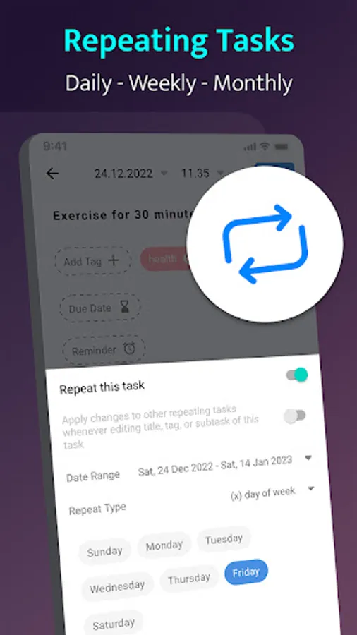 🔁 Recurring tasks: Set up tasks to repeat on a regular basis, such as weekly or monthly, to help you manage your routine.