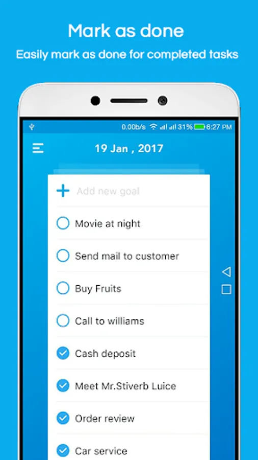 Calls, To send mails, Places to go etc. all goals will be listed and yo can remove it by swiping left or right.
