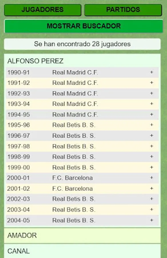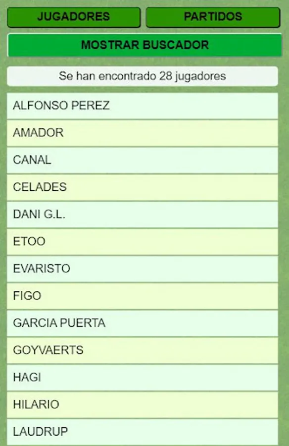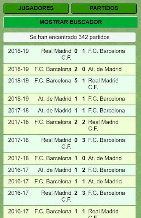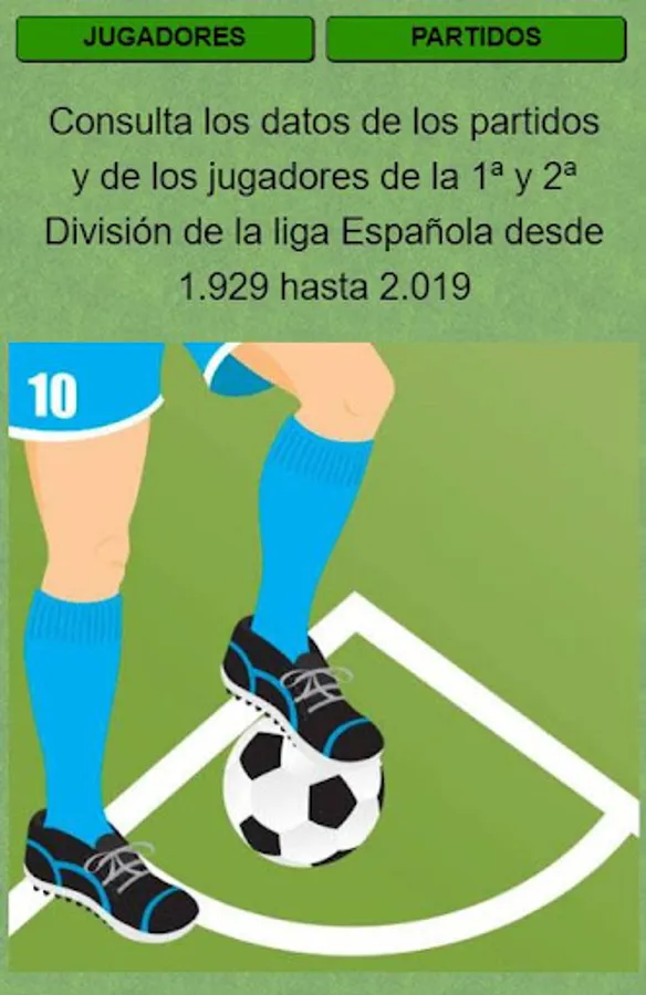 You will be able to know the result of any match of the first or second division of the league since 1.929. The classification of all football seasons. The data of your favorite players in the Spanish league such as Leo Messi, Cristiano Ronaldo, Neymar, Di stefano, Cubala, Gento, Cruif, Arconada, Maradona ...