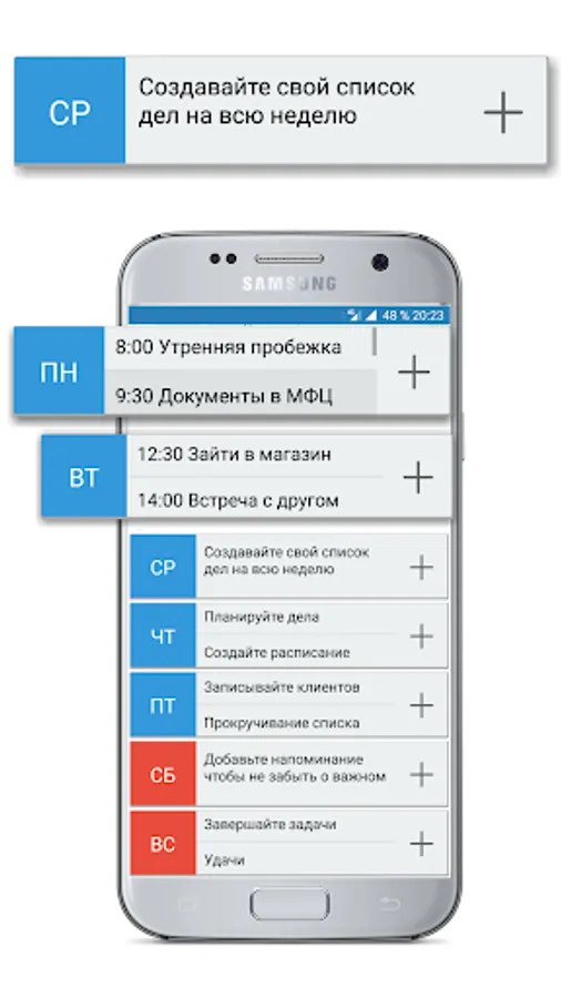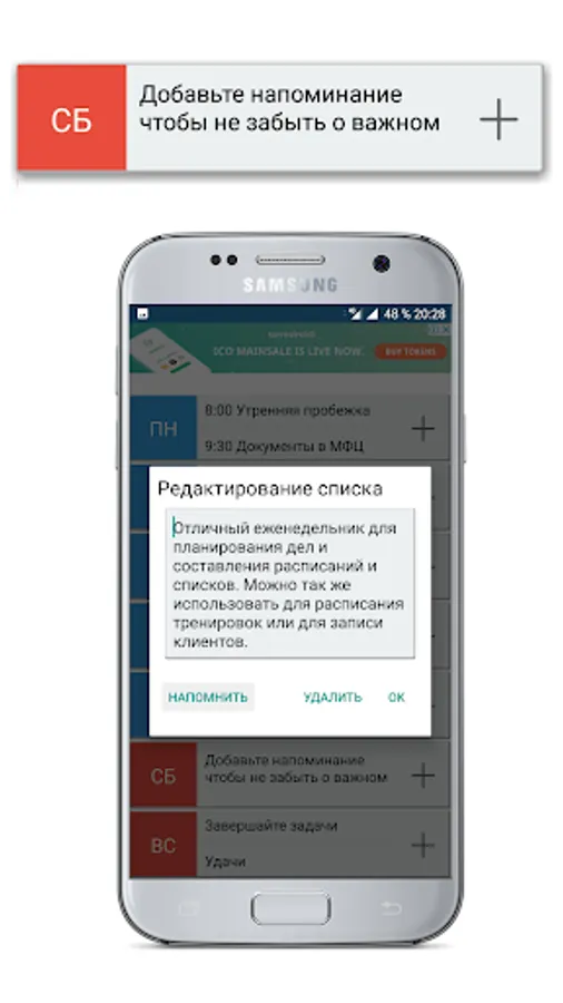 Set reminders to not forget about important events. Edit and delete the completed tasks and the new plan ...