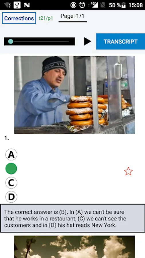 On the application: Part 1 is composed of 10 pictures that will be displayed 5 at a time. You are going to listen to 4 sentences per picture and must select the one that corresponds to the associated picture. No description will be written. Only the letters A, B, C, and D will be written.