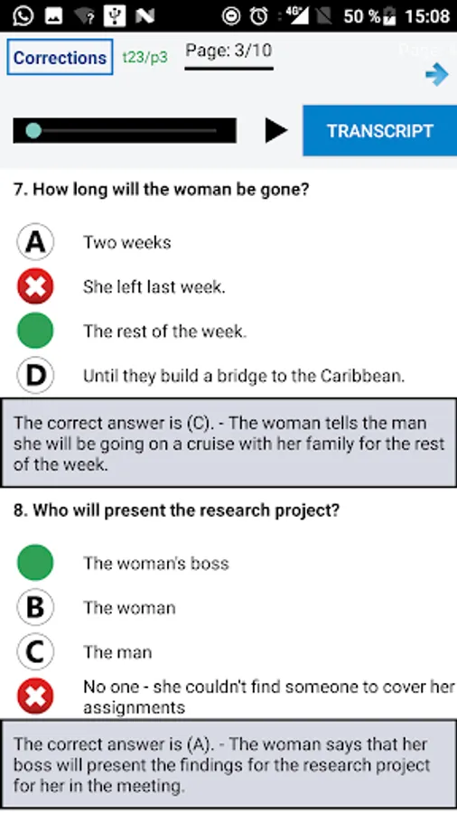 This application provides you with 9 full part Listening tests for a total of more than 900 questions so you can conveniently prepare your TOEIC with corrections.