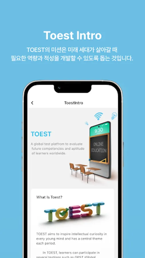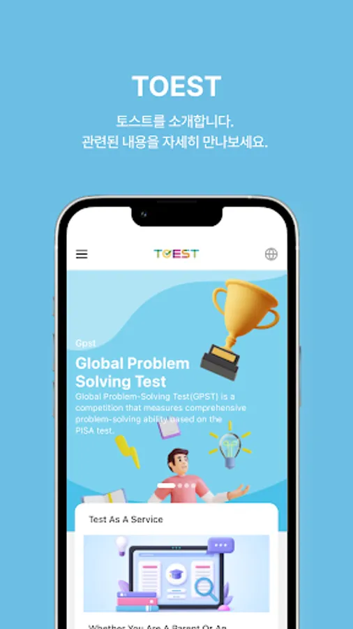 The purpose of the TOEST app is to help future generations develop the necessary competencies and aptitudes for life. In TOEST, learners can participate in various online tests such as Global Problem Solving Test (GPST), Silicon Valley Mathematics Test (SMC), and e~Test (Computer Literacy Test).