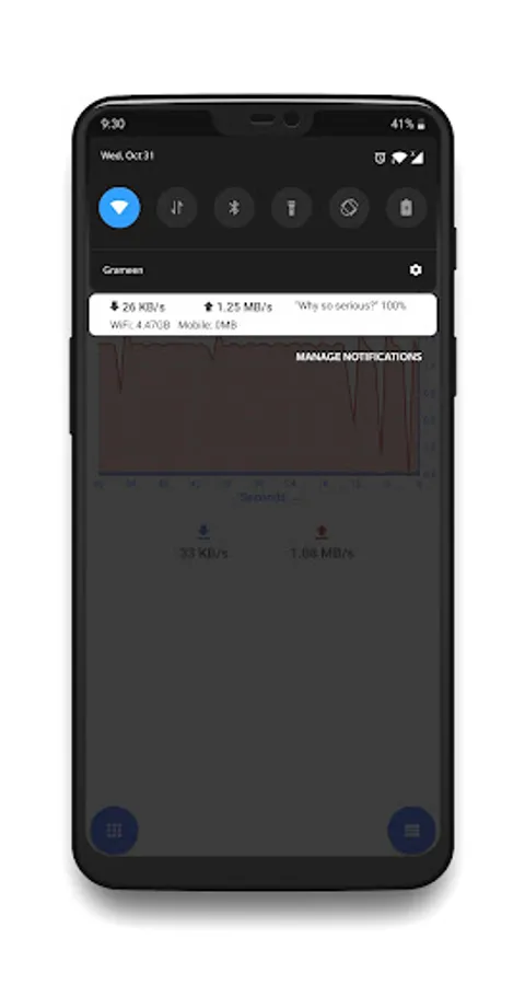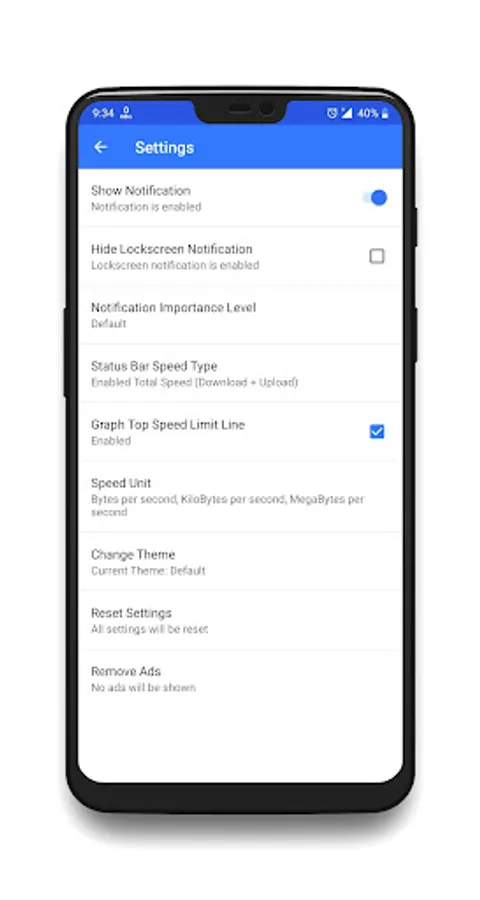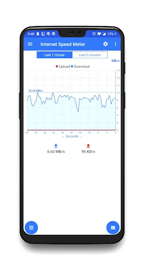 Internet Speed Meter displays real-time internet speed in status bar, notification bar and shows the amount of data in notification bar. It also shows download and upload speed in real-time graph.