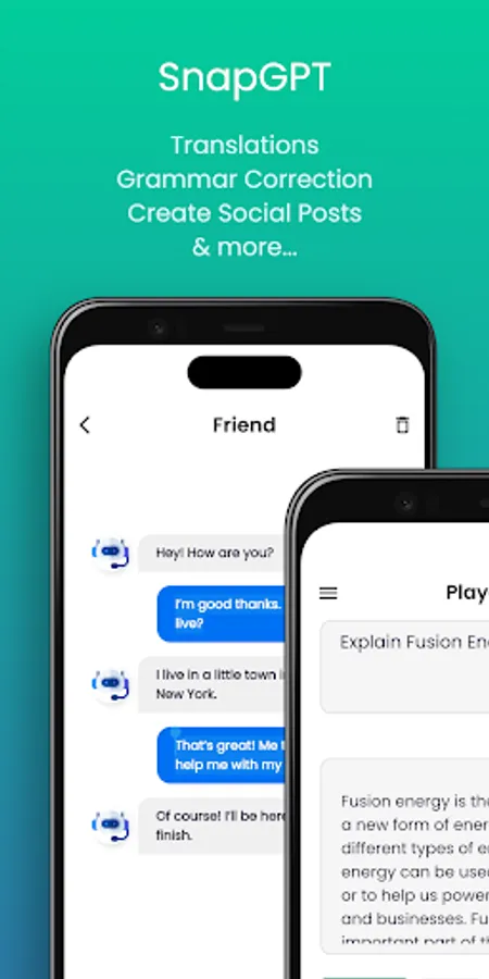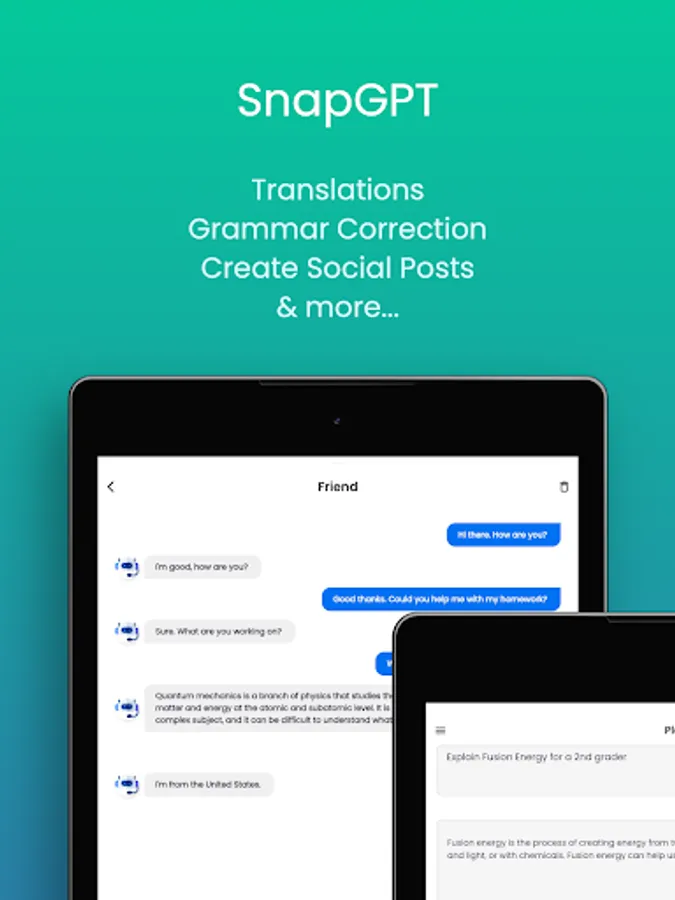 Introducing SnapGPT - the revolutionary chatbot app that allows you to have conversations with your friends like never before! Powered by GPT-3 AI, ChatGPT allows you to have natural, interactive conversations with your friends in a fun and engaging way. With its advanced language understanding capabilities, you can easily chat with your friends in a more natural, conversational manner. Experience the best in AI-powered messaging and conversation with ChatGPT!